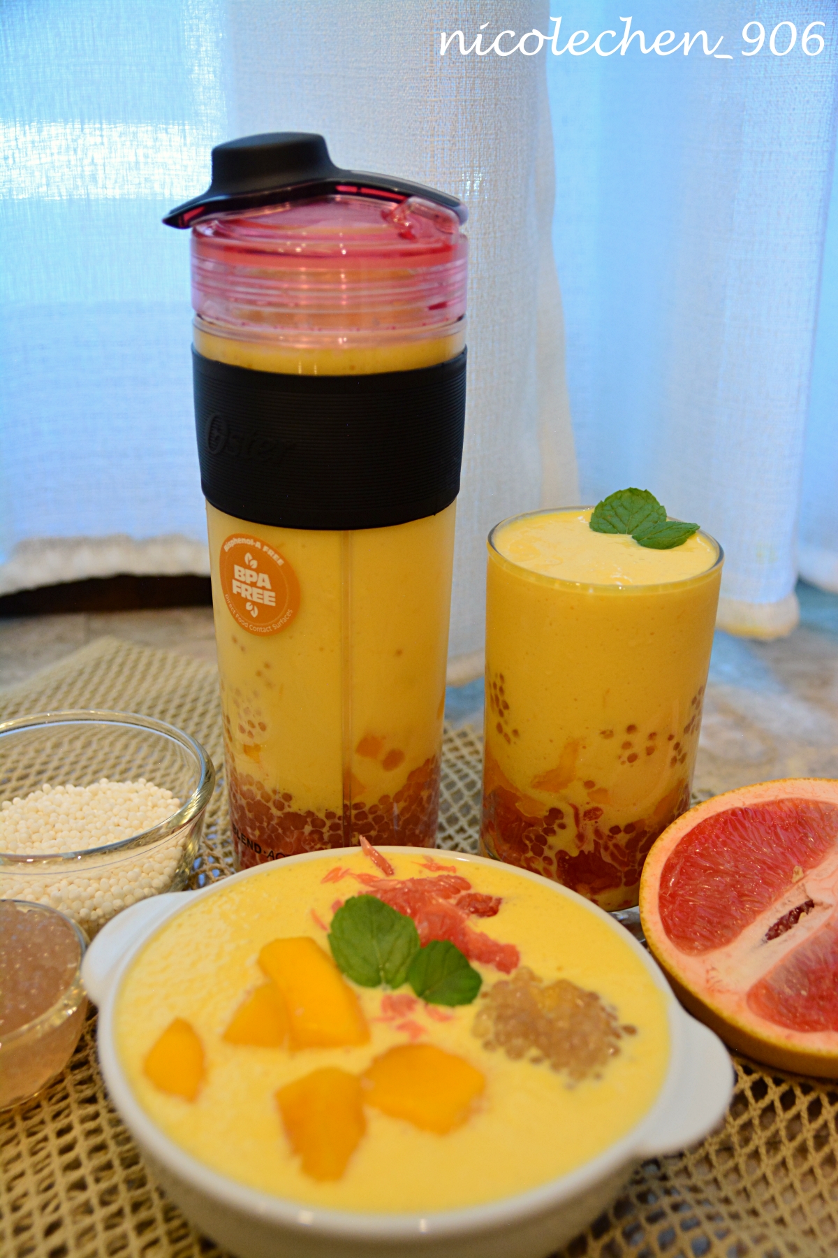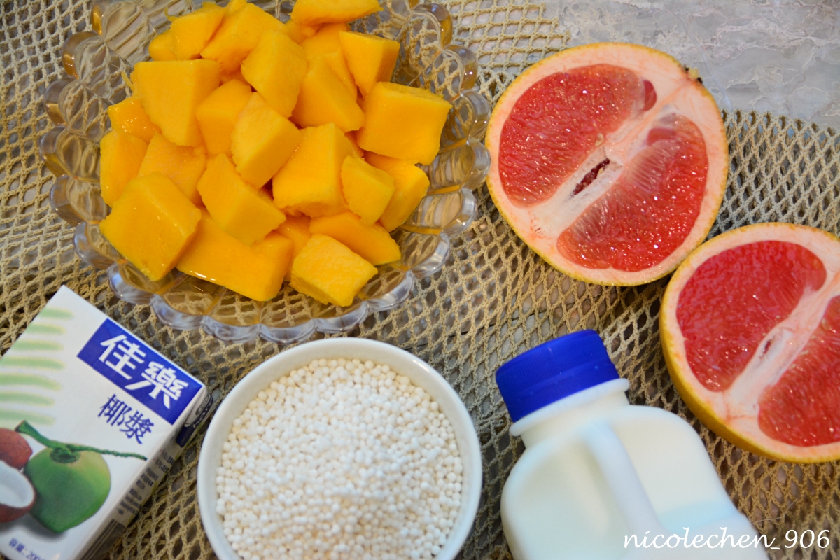 需要的食材:愛文芒果、葡萄柚、椰漿、牛奶、西谷米。