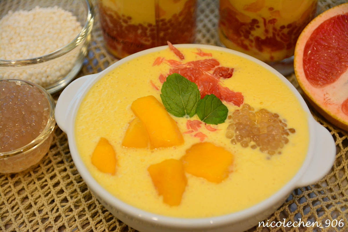 - 碗內放入煮好的西谷米、葡萄柚果肉、芒果塊,並淋上一大湯匙的椰漿即可。