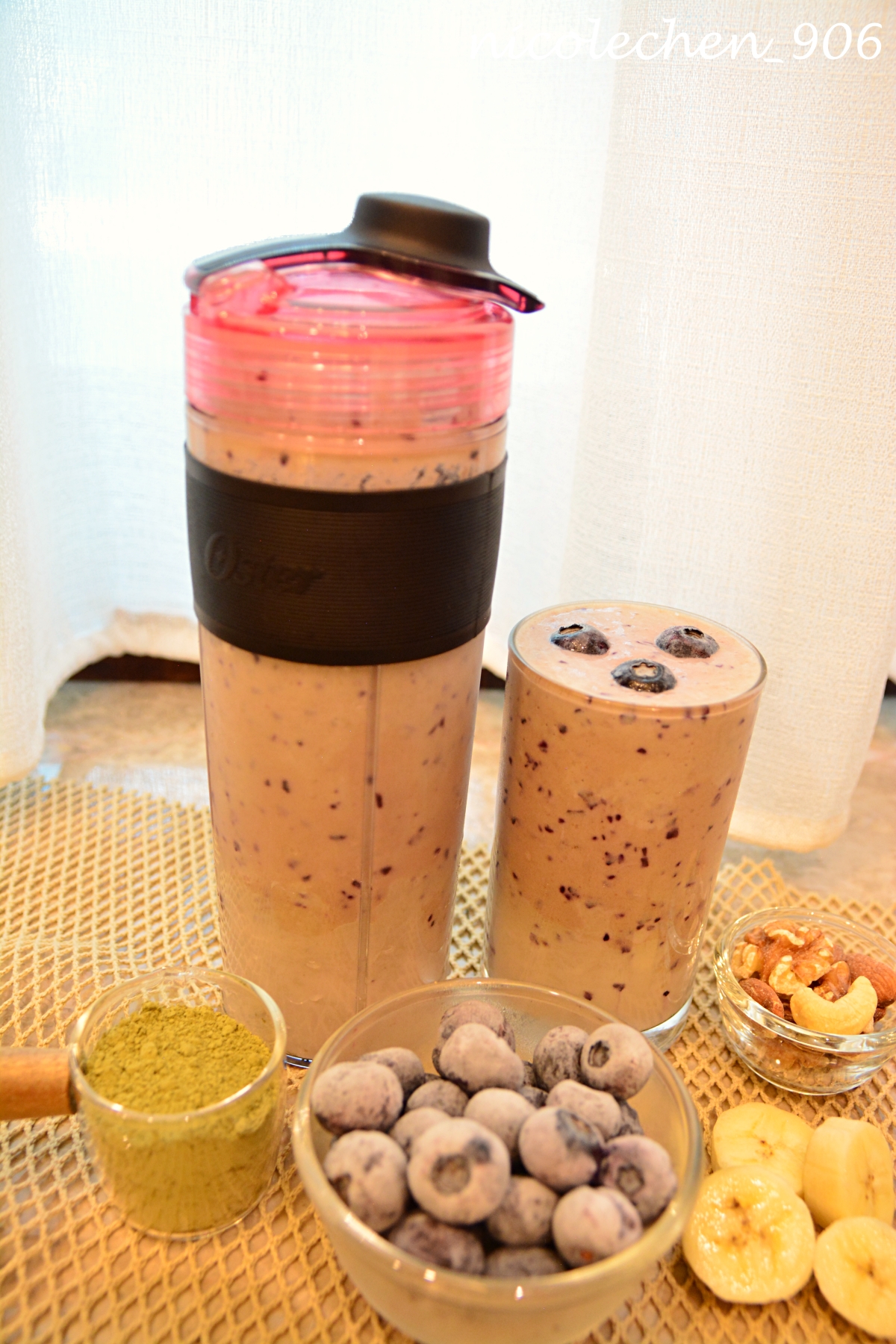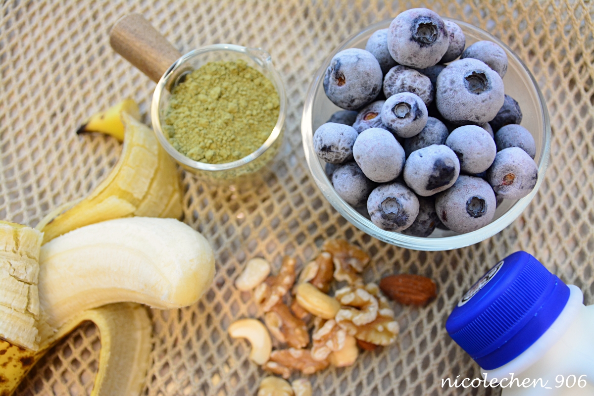 需要的食材:香蕉、藍莓、抹茶粉、市售可即食無調味堅果、牛奶。