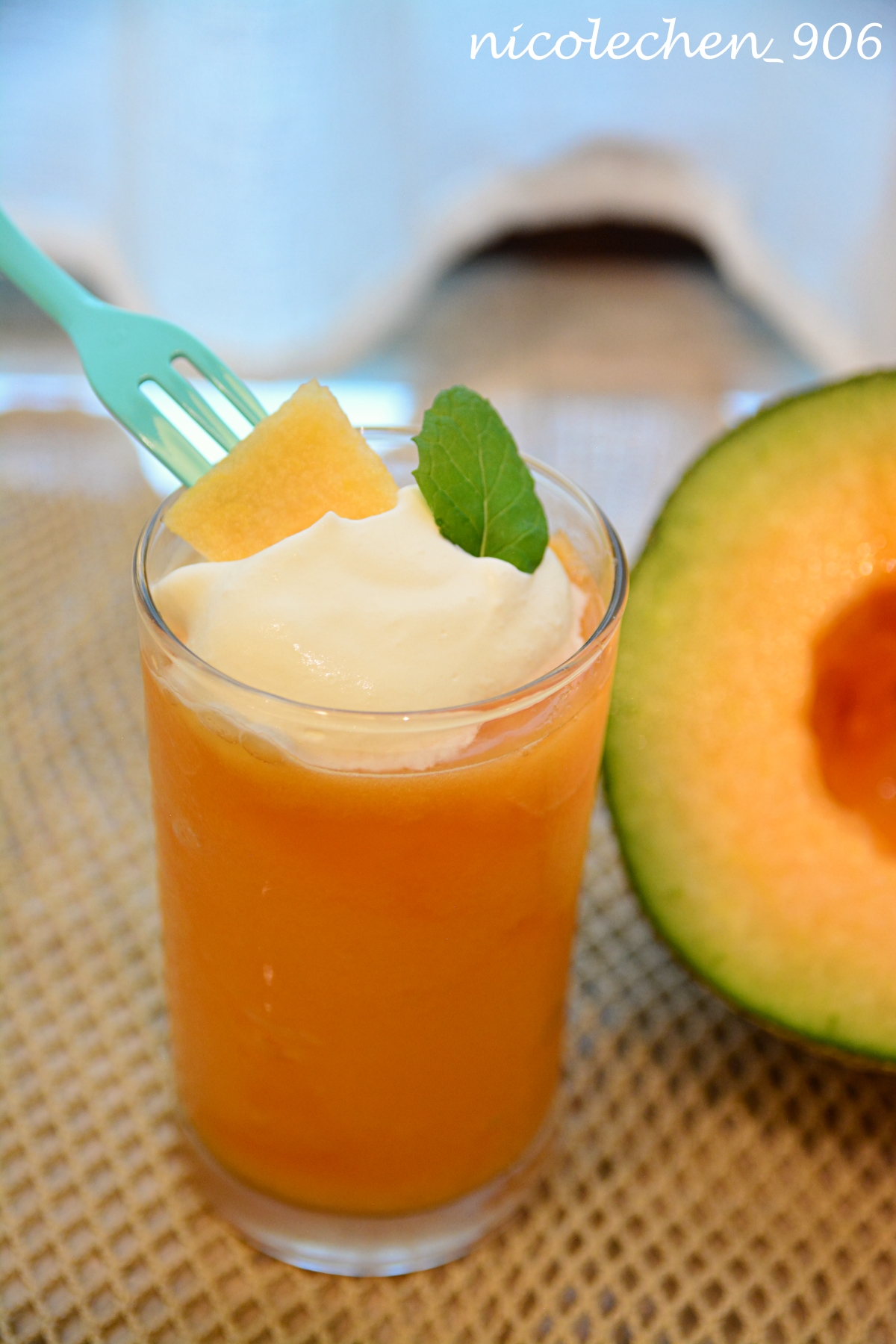- 倒入杯子並用鮮奶油、哈密瓜丁、薄荷葉裝飾即可。
